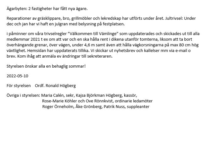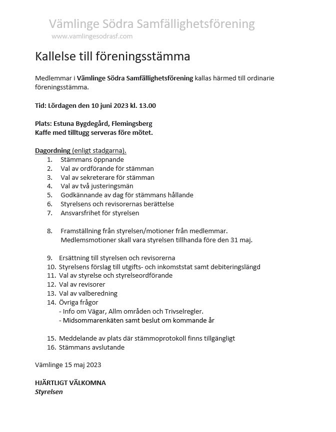 Medlemmar i Vämlinge Södra Samfällighetsförening kallas härmed till ordinarie föreningsstämma. Endast en person per fastighet väntas närvara då vi pga corona-pandemin måste hålla gällande avstånd. Det blir heller ingen förtäring pga av dessa omständigheter. Vi försöker genomföra ett kort möte.